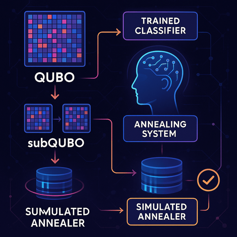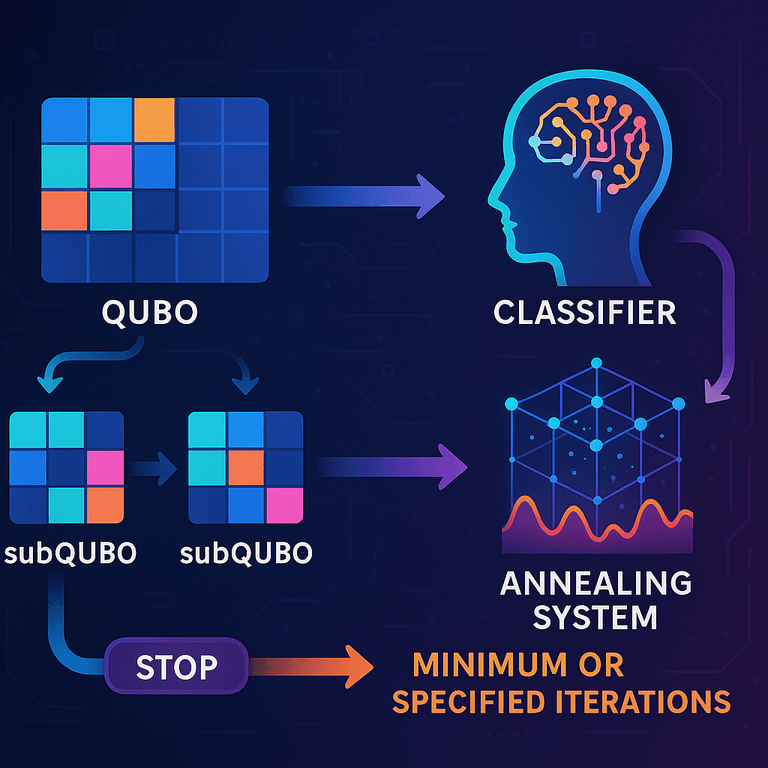 First, you start with a big QUBO problem. The system cuts this problem into smaller subQUBOs. Each small piece is easier to handle. But instead of just picking a solver and running with it, the system uses a trained classifier to look at each subQUBO. The classifier is like a smart advisor. It looks at the numbers in the subQUBO and says, “For this one, you should use a certain kind of annealer.” An annealer can be a classic simulated annealer, a simulated quantum annealer, or a real quantum computer.