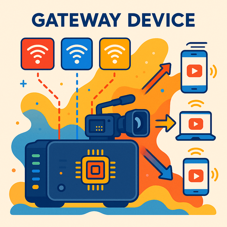 The gateway has several radio modules (RF transceivers), for cellular, satellite, Wi-Fi, and more. It can hold multiple SIM cards for different network providers. The device checks which network is fastest and most reliable at any moment, and picks that one to send your video. If the current network gets slow or fails, it switches to another—maybe from cellular to satellite—without stopping the stream.