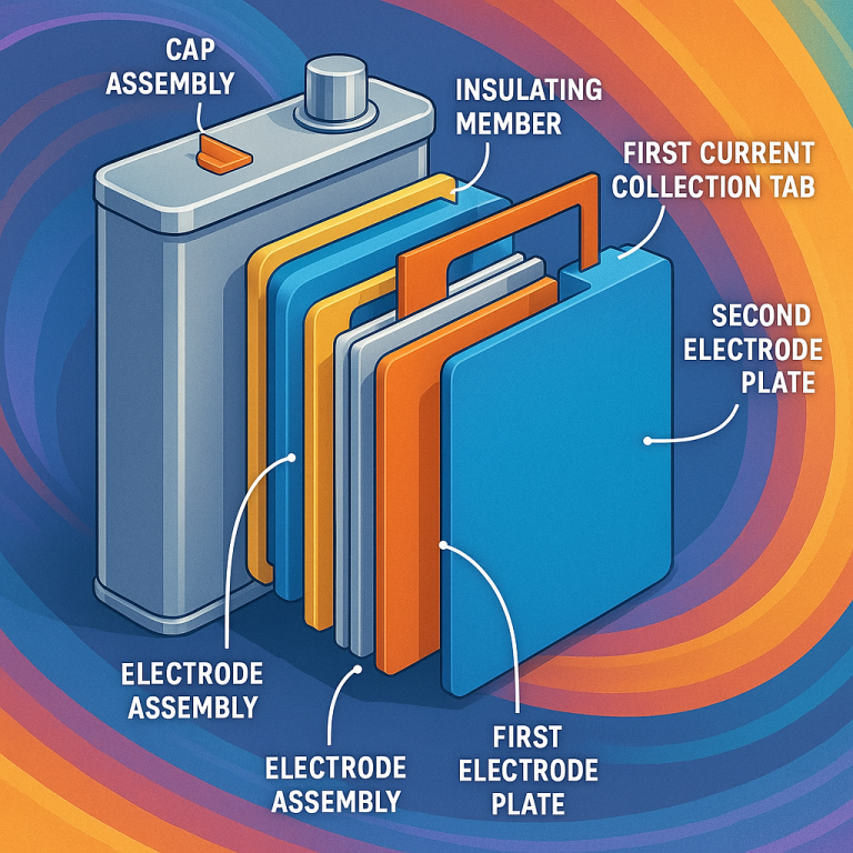 To understand why this patent matters, let’s look at how batteries have worked up until now. A typical secondary battery has a few main parts: two plates (called electrodes), a separator (to keep them from touching each other), and a liquid or gel (the electrolyte) that lets electric charges move between the plates. The plates are inside a case, and there are tabs (flat pieces of metal) that connect these plates to the outside world. These tabs usually stick out through the top or side of the battery, letting you connect the battery to a device.