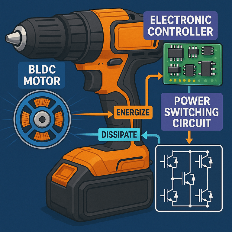 5. No Extra Parts: The system does not need extra resistors, diodes, or capacitors. It just uses the switches and controller already found in modern brushless power tools, making it easy to add to new designs.