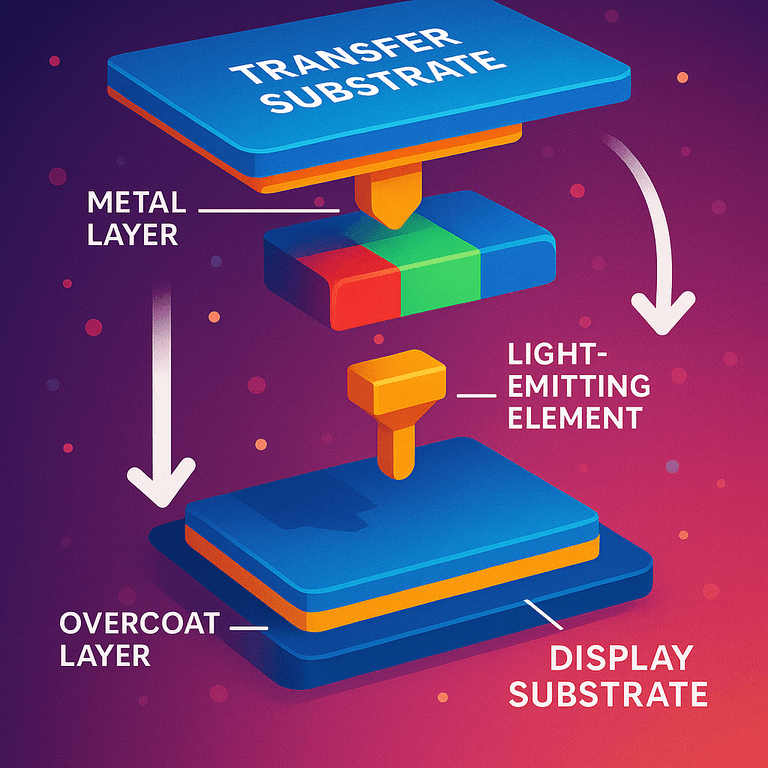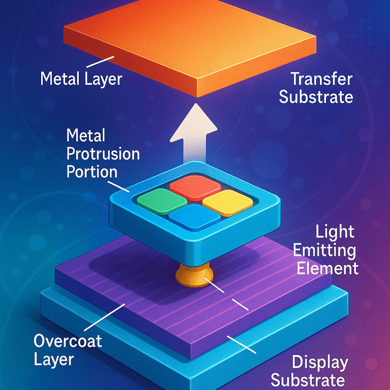 Next, the transfer substrate is lined up with the main screen (the display substrate). The light part is gently pushed onto the screen’s “overcoat layer,” which may have glue or a sticky material. The bond between the light part and the overcoat is made to be stronger than the bond between the metal peg and the light part. When the transfer substrate is pulled away, the metal peg pulls free from the light part and stays behind, still stuck to the transfer substrate. The light part stays stuck on the screen where it belongs.