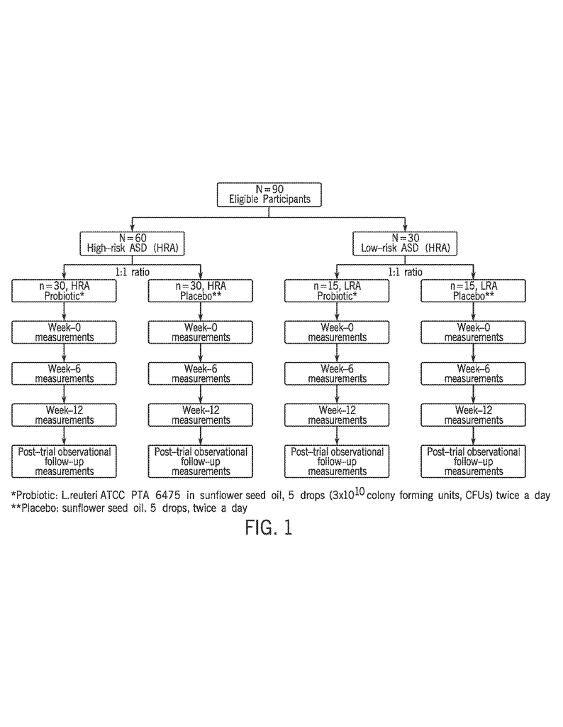 To prove the method works, the patent describes a large clinical study. High-risk babies (those with an older sibling with ASD) and low-risk babies are enrolled. Some get L. reuteri, some get a placebo, and all are followed until age two. The study checks how L. reuteri levels, oxytocin, and brain responses change over time, and whether these predict later ASD diagnosis. This careful design ensures that the method is tested in a real-world setting, with enough data to draw strong conclusions.