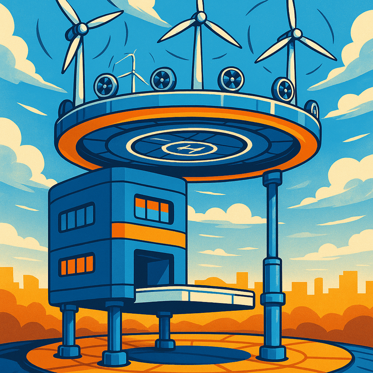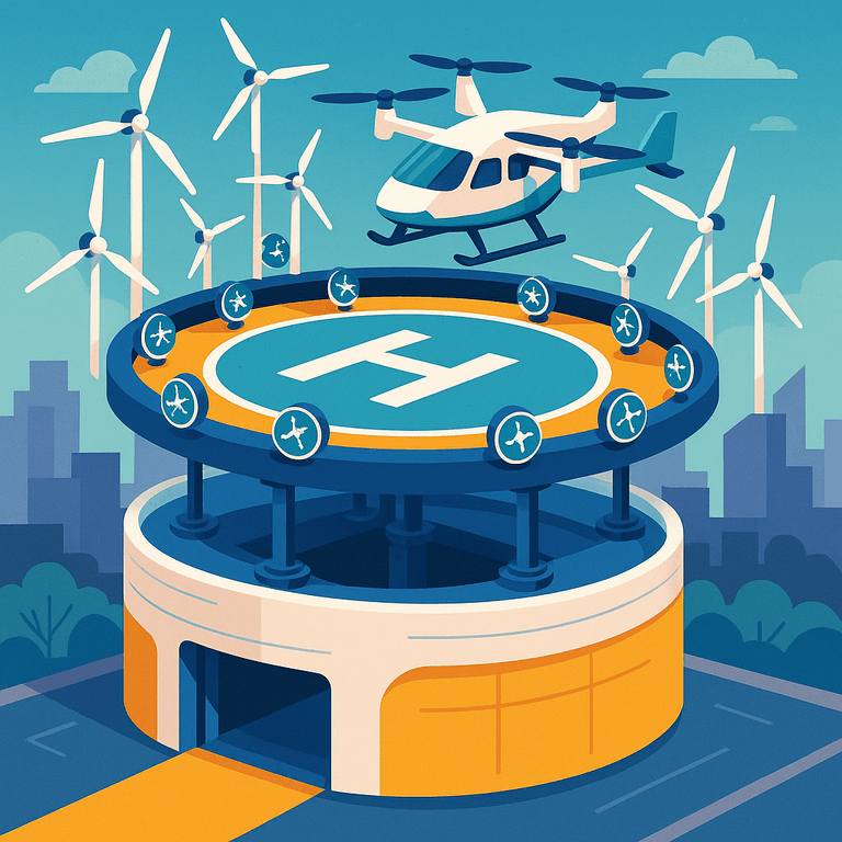 People are also thinking more about the environment. If we want cities to be cleaner, we need to find new ways to make and use energy. Using renewable sources, like wind or sun, is one answer. But for vertiports, wind is tricky. The wind in cities is often blocked by buildings, and there is not much open space to put up big wind turbines. But what if there was a source of strong wind right there at the vertiport every time a flying vehicle lands or takes off? That’s where this invention comes in.