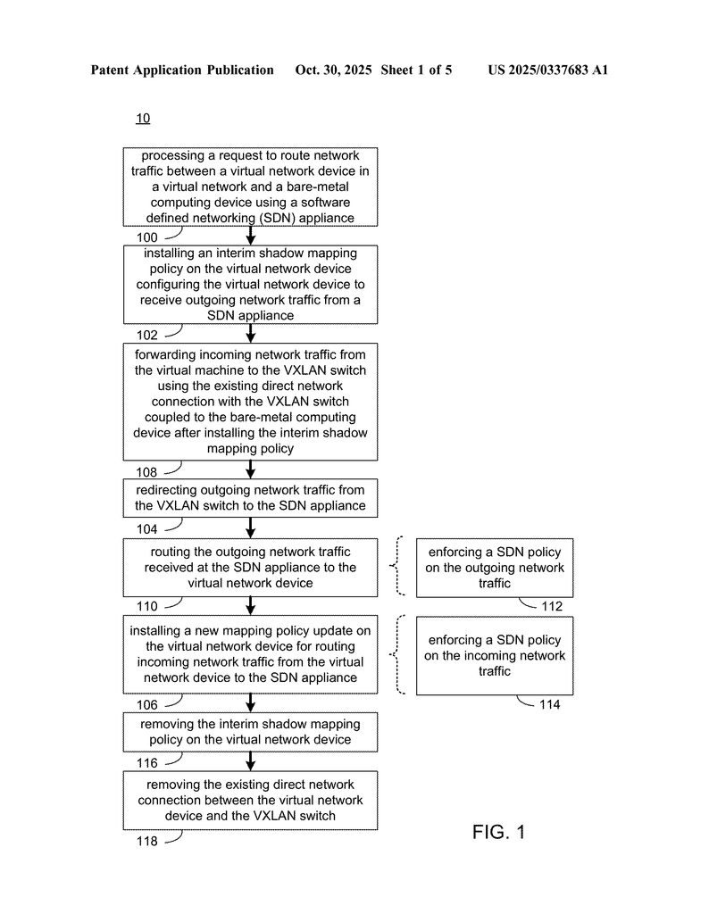 2. Installing an Interim Shadow Mapping Policy: Before making any changes, the system puts a temporary “shadow” policy on the virtual network device. This policy tells the virtual device, “You can now accept traffic from the SDN appliance, but keep sending your own traffic to the VXLAN switch as before.” It’s like opening a new door for traffic coming in, but not yet changing where outgoing traffic goes. This makes sure that, if any packets start coming from the SDN appliance, the virtual device will know what to do with them. No packets get dropped just because they come from an unexpected place.