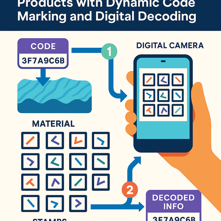 This invention can help many industries. For example, a wood seller can stamp codes on logs to show where they came from and prove they are not from illegal logging. A car maker can stamp codes on parts to stop the use of fake parts. A food maker can stamp codes onto packaging to show where and when something was made. Because you can add location and time to the code, it’s easy to track things as they move from place to place.