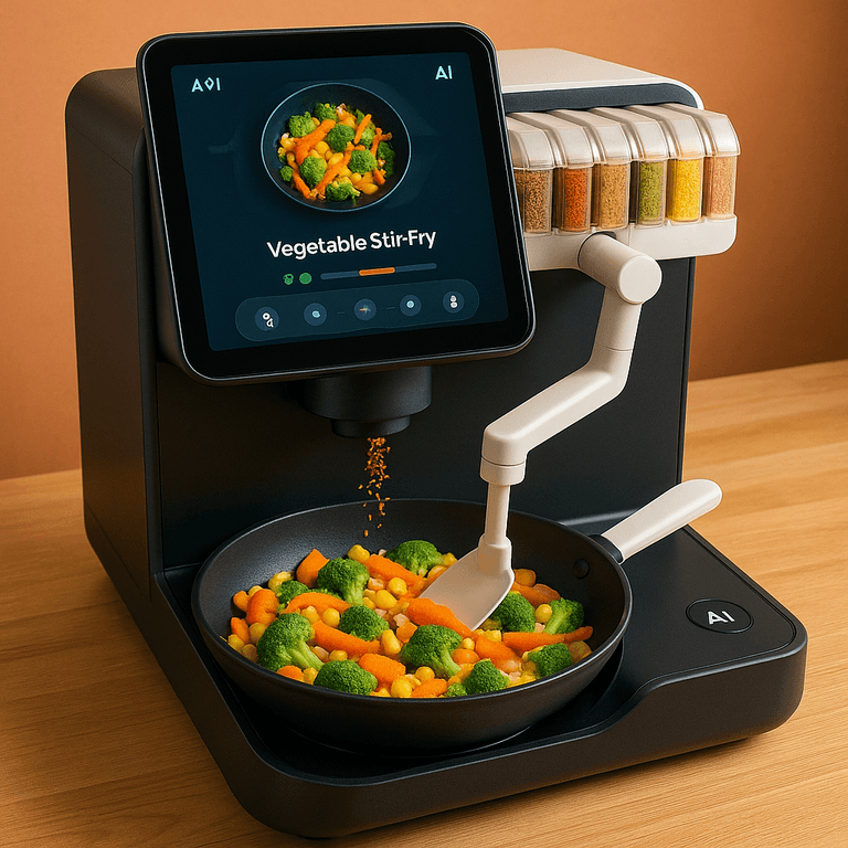 This new countertop cooking appliance is more than just another kitchen gadget. It brings together smart ingredient delivery, precise stirring, careful heating, and advanced vision—all under the control of a smart, learning brain. It helps anyone cook meals that are just right, every time, with very little effort. It learns from each meal and gets smarter over time. If you want a kitchen that truly works for you, this invention is a big step in the right direction.