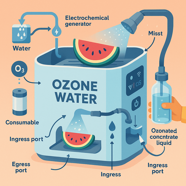 The new patent builds on this science and these shortcomings. It uses an electrochemical generator to make ozone in water, so there are no dangerous nitrogen byproducts. It gives users the choice between mist, spray, and immersion. It lets users control how wet things get, and how deep the clean goes. It also makes it easy to check the status, replace parts, and keep the system running well.