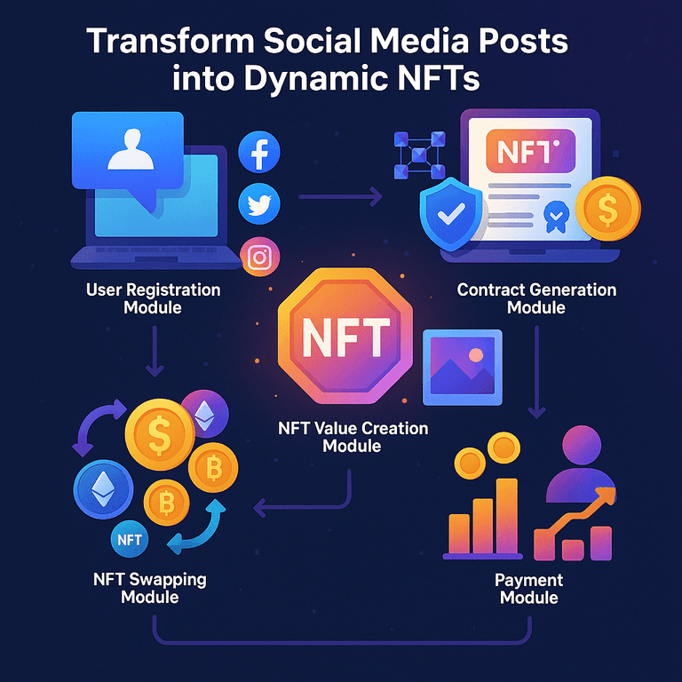 Social media is not just for sharing anymore—it can be a place to own, trade, and earn. This new system makes it safe and easy to turn your posts into dynamic NFTs. It brings together all the tools you need: registration, contracts, payments, value tracking, and trading, all built on blockchain for security and trust. Whether you are a creator, a fan, or a brand, this invention opens up new ways to connect, reward, and grow. The future of social media is here, and it’s more valuable than ever before.