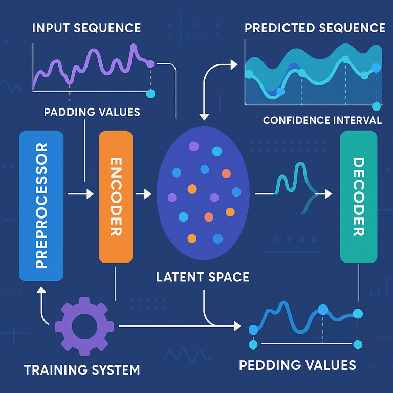 2. Encoding: The padded sequence is passed through an encoder—a special type of neural network (often a “Variational Autoencoder” or VAE). This encoder compresses the data into a “latent space”—a small, dense representation that captures the most important patterns.