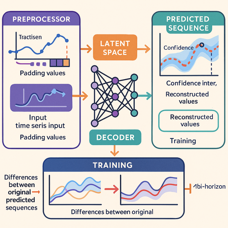 3. Decoding: The “latent space” vector is then passed to a decoder, which tries to reconstruct the full original sequence. The decoder is trained to pay special attention to the missing (padded) parts, learning how to predict them accurately based on the historical data.