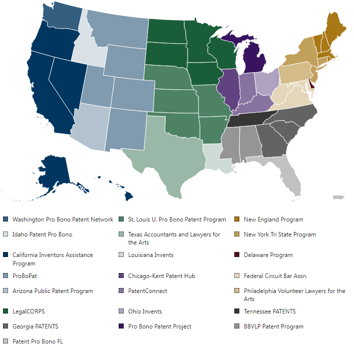 To apply to your state’s regional program, simply click on this map at the USPTO and get access to online application forms for all regional programs. For more information, visit https://www.uspto.gov/patents/basics/using-legal-services/pro-bono/patent-pro-bono-program